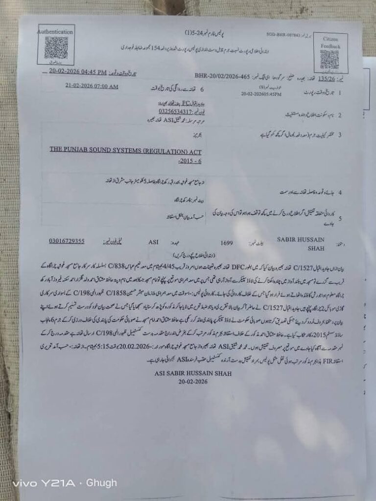 بھیرہ تھانے کے ملحقہ گاوں کی معروف مذہبی درسگاہ جامعہ مسجد غوثیہ بھیرہ میں لاوڈ اسپیکر پر چندہ اپیل کرنا