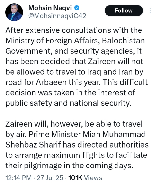 ڈان نیوز کے مطابق وفاقی وزیر داخلہ محسن نقوی نے سماجی رابطے کی ویب سائٹ ’ایکس‘ پر پیغام میں کہا کہ زیارت اربعین کے لیے عراق و ایران کےفضائی سفر کی اجازت ہوگی۔