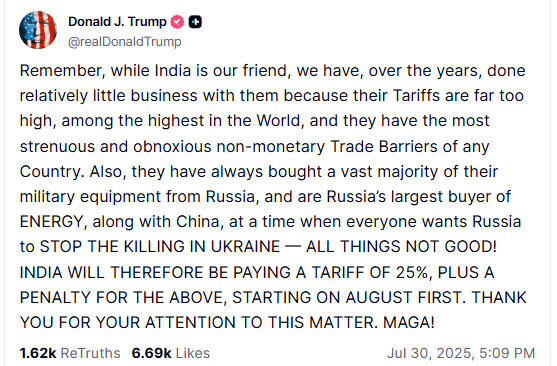 ٹرمپ نے کہا کہ لہٰذا، بھارت پر یکم اگست سے 25 فیصد ٹیرف عائد کیا جائے گا، اور اوپر بیان کردہ امور پر ایک اضافی جرمانہ بھی لگایا جائے گا۔