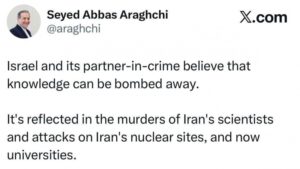 ایران کے وزیر خارجہ، سید عباس عراقچی نے امریکا اور اسرائیل کی جانب سے ایرانی یونیورسٹیوں پر بمباری کی شدید